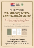 Zorica MANOJLOVIĆ: Dr. Milivoj Mirza Abdurahman Malić (Život i djelo vrsnog orijentalista i poliglota, Imotski 1897. - Sušak 1935.). Predavanje više arhivistice Zorice Manojlović, održano 21. veljače 2014. u Kongresnoj dvorani Islamskog centra u Rijeci. Organizatori predavanja Hrvatsko-tursko društvo Rijeka u suradnji s Državnim arhivom u Rijeci i Medžlisom Islamske zajednice Rijeka. Rijeka 2014. | |